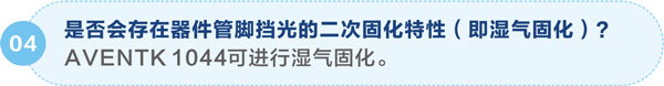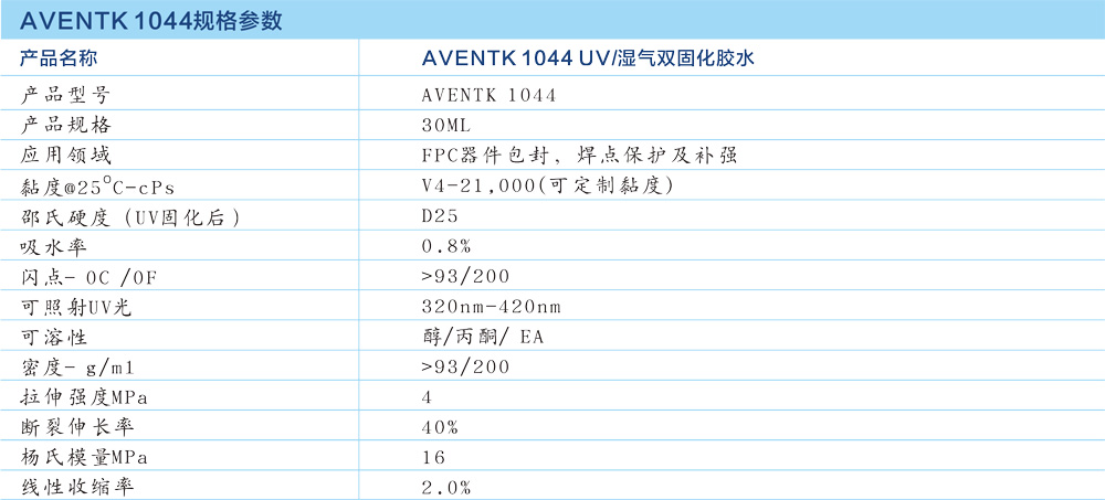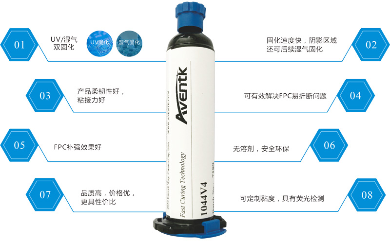 AVENTK 1044系列UV/濕氣雙固化FPC補強uv膠——主要應用于FPC軟板上焊點(diǎn)保護、電子元器件包封。能有效阻隔濕氣和其他化學(xué)物質(zhì)對焊點(diǎn)和元器件的侵蝕,提高元器件的附著(zhù)強度。不含有機溶劑,100%固含;能對陰影區進(jìn)行二次濕氣固化,在黑燈下具有亮藍熒光色,方便在線(xiàn)檢測,可提供免費試樣和訂制黏度