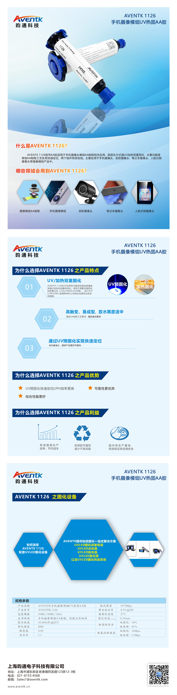 AVENTK 1126K10型號AA膠具有高觸變、易成型滿(mǎn)足AA制成工藝;黑度適中,滿(mǎn)足遮光要求;UV預固化速度比較快,實(shí)現快速定位;老化衰減小,提供產(chǎn)品更好可靠性等特點(diǎn)。