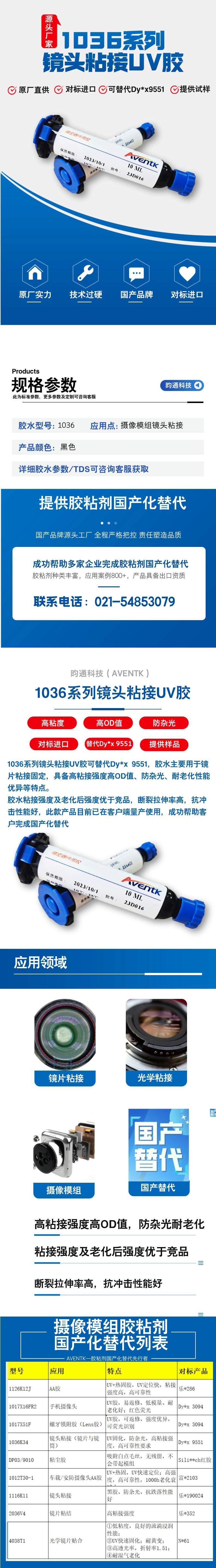 1036系列鏡頭粘接UV膠可替代Dy*x 9551,膠水主要用于鏡片粘接固定,具備高粘接強度 、高OD值、防雜光、耐老化性能優(yōu)異等特點(diǎn) 膠水粘接強度及老化后強度優(yōu)于競品,斷裂拉伸率高,抗沖擊性能好,此款產(chǎn)品目前已在客戶(hù)端量產(chǎn)使用,成功幫助客戶(hù)完成國產(chǎn)化替代