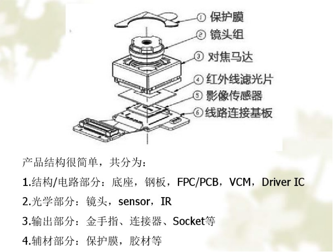 從上圖我們可大致的看出,一個(gè)簡(jiǎn)單的攝像頭各組成部分。首先,在保護膜的保護下,前段的鏡頭組中,當今已由最初的玻璃換為先用的塑料件。一個(gè)鏡頭又由多個(gè)部分組成,這里不具體的列舉。