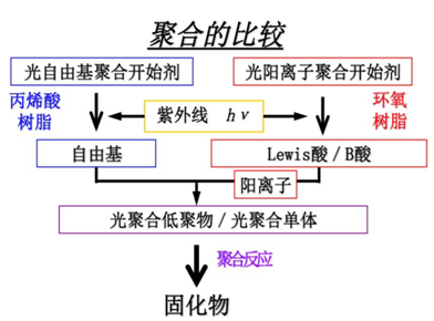 如下圖所示,UV膠大致分為自由基聚合型和陽(yáng)離子聚合型,由于其聚合機理不同,其選用的光引發(fā)劑以及需要的能量也不相同。同時(shí)自由基聚合型還需要考慮由于氧氣阻聚而產(chǎn)生的表干問(wèn)題,導致可能需要更高UV LED光強的設備。甚至有部分產(chǎn)品是不適合用UV LED設備固化的情況。
