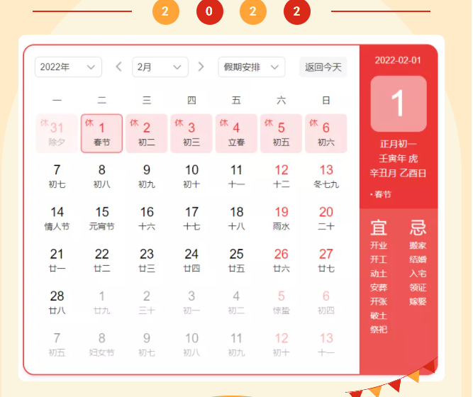 2022年1月31日(除夕、周一)-2022年2月6日(初六、周日),共放假7天。